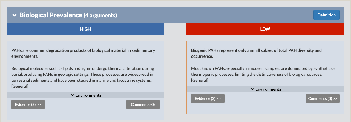 Within any given potential biosignature, we then have a branching tree that shows the arguments that support biological and abiotic signals for that specific feature.